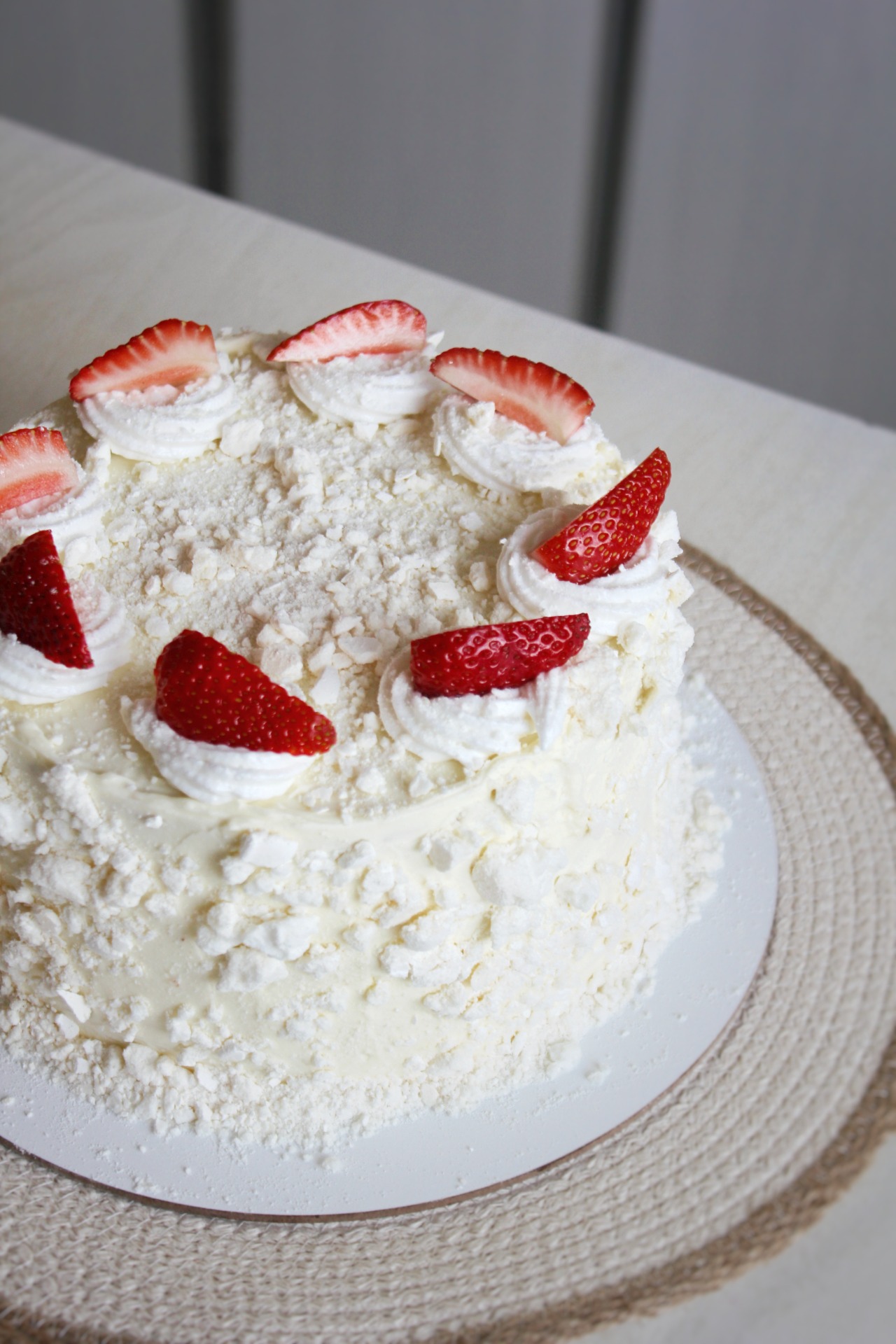 Bizcochuelo genoise super esponjoso embebido con almibar de oporto. Relleno de dulce de leche con merengue seco y crema chantilly con duraznos o frutillas (a eleccion)
