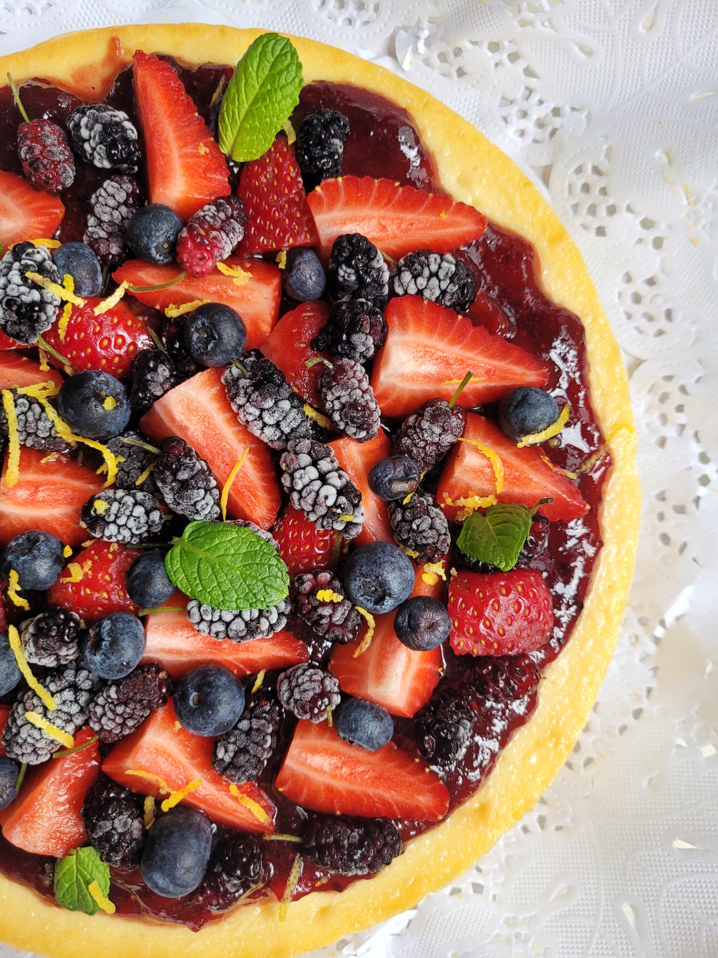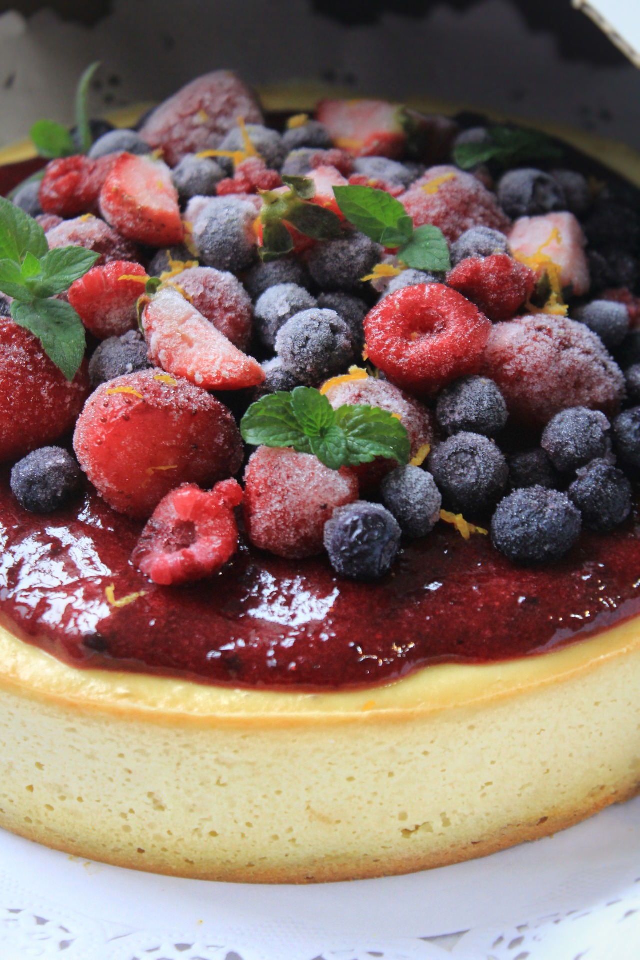 Cheesecake super cremoso al estilo New York (horneado). Base de masa sablee, creamcheese y mermelada casera, frutos rojos para decorar (frescos en época, freezados el resto del año)