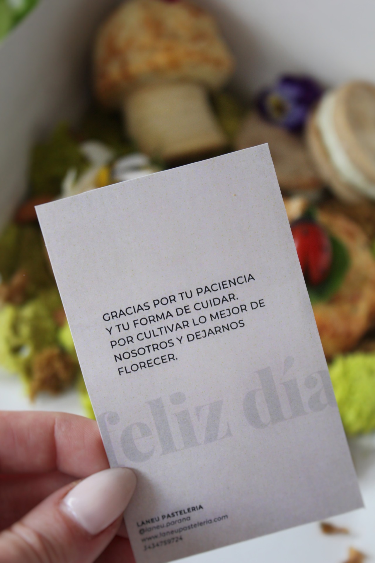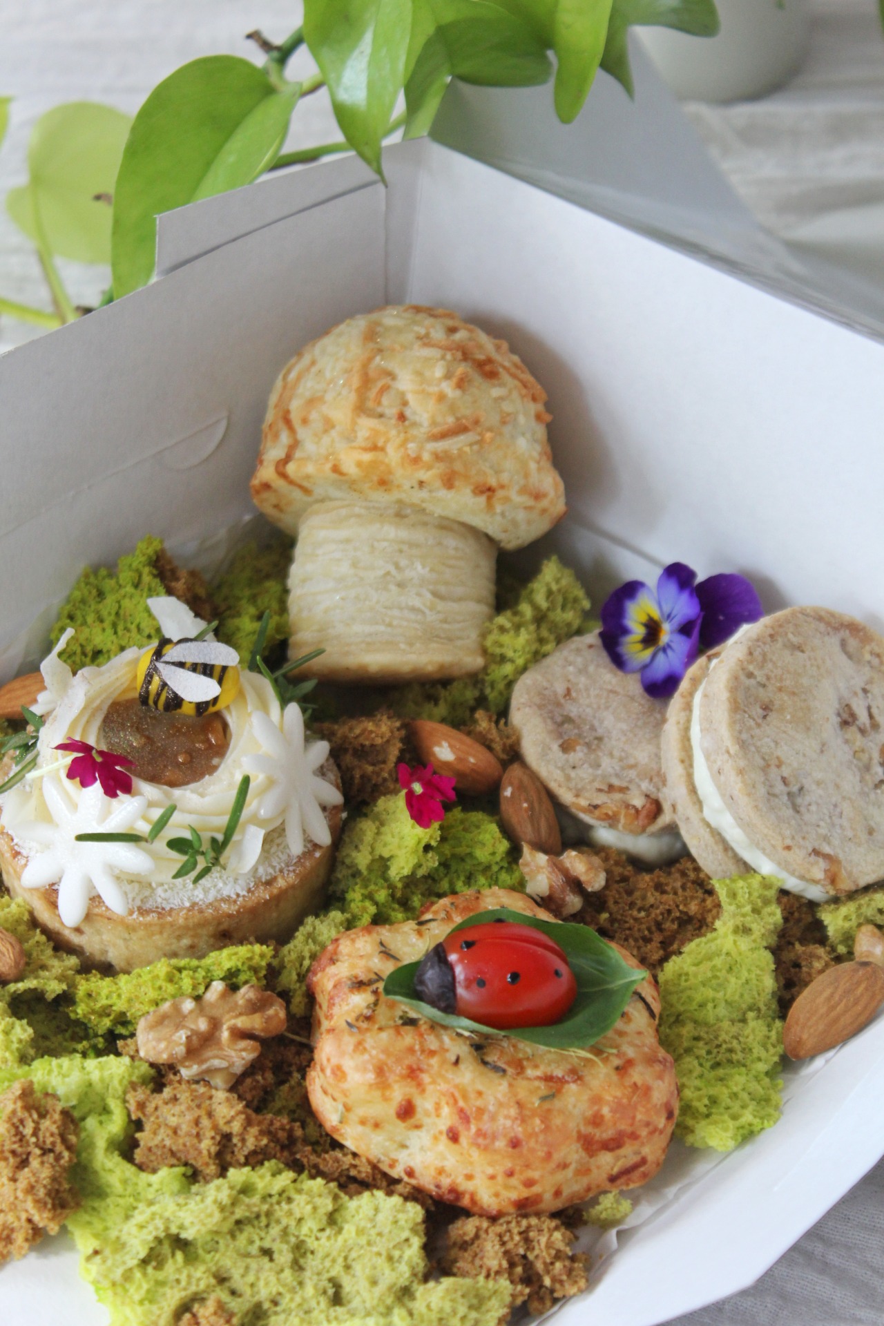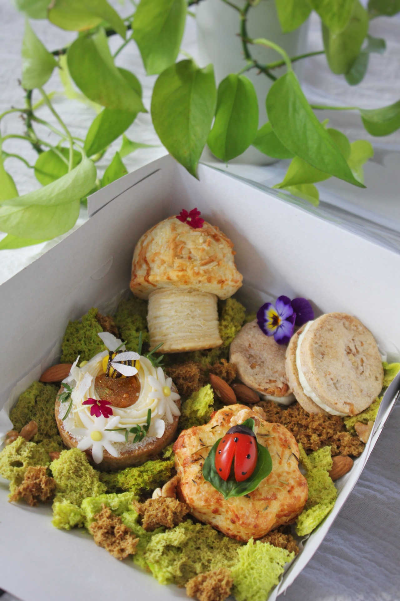Este box es mayormente salado, 5 piezas sobre bizcochuelo neutro, simil musgo.