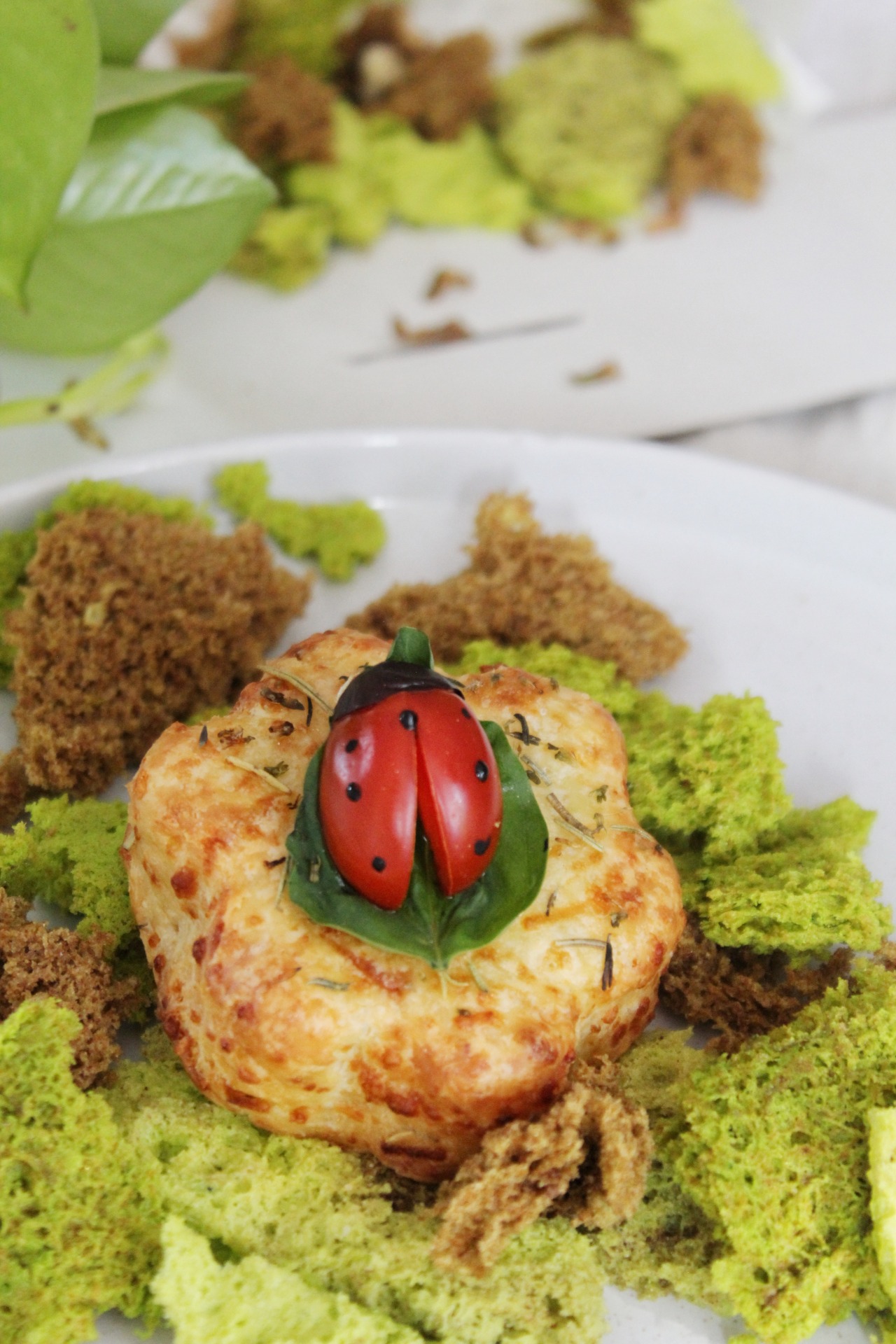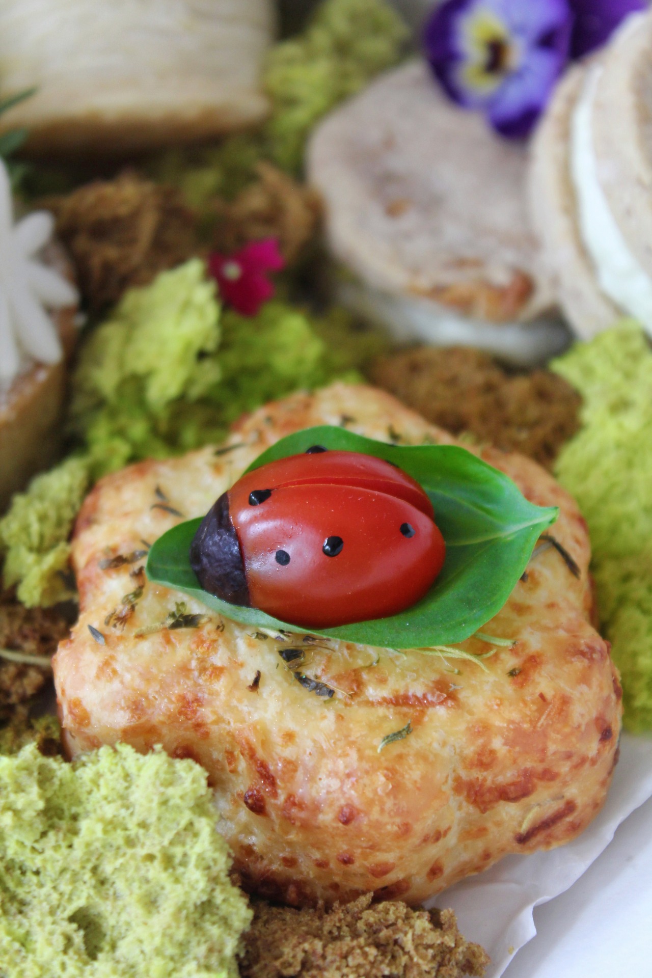 🧀 Scon de queso reggianito y tomillo con mariquita de cherry y aceituna