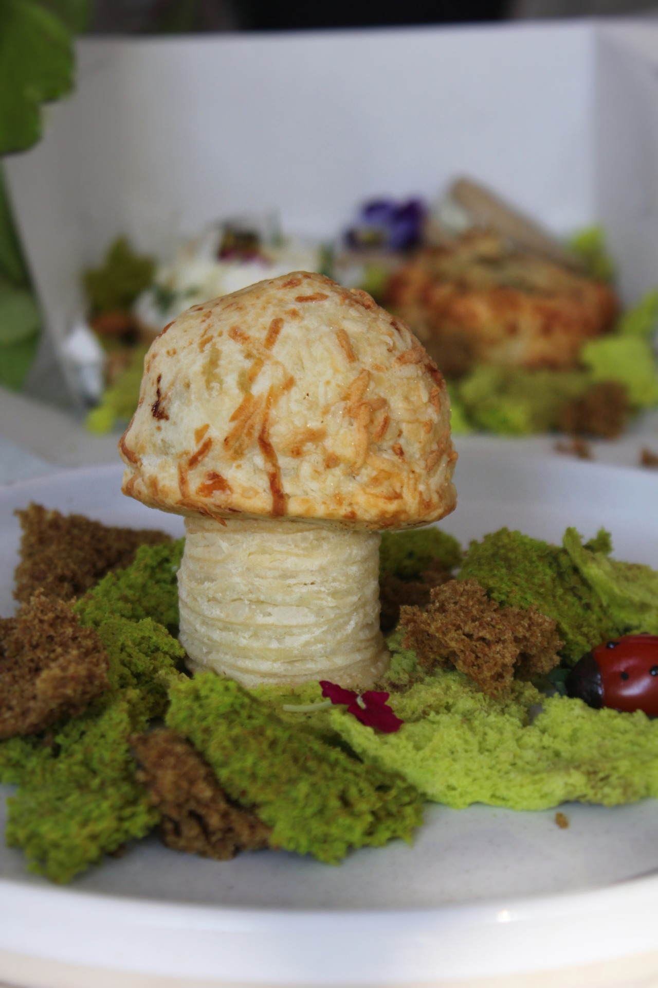 🍄 Mushroom de chipa sobre base de hojaldre, ambos rellenos con bondiola desmechada.